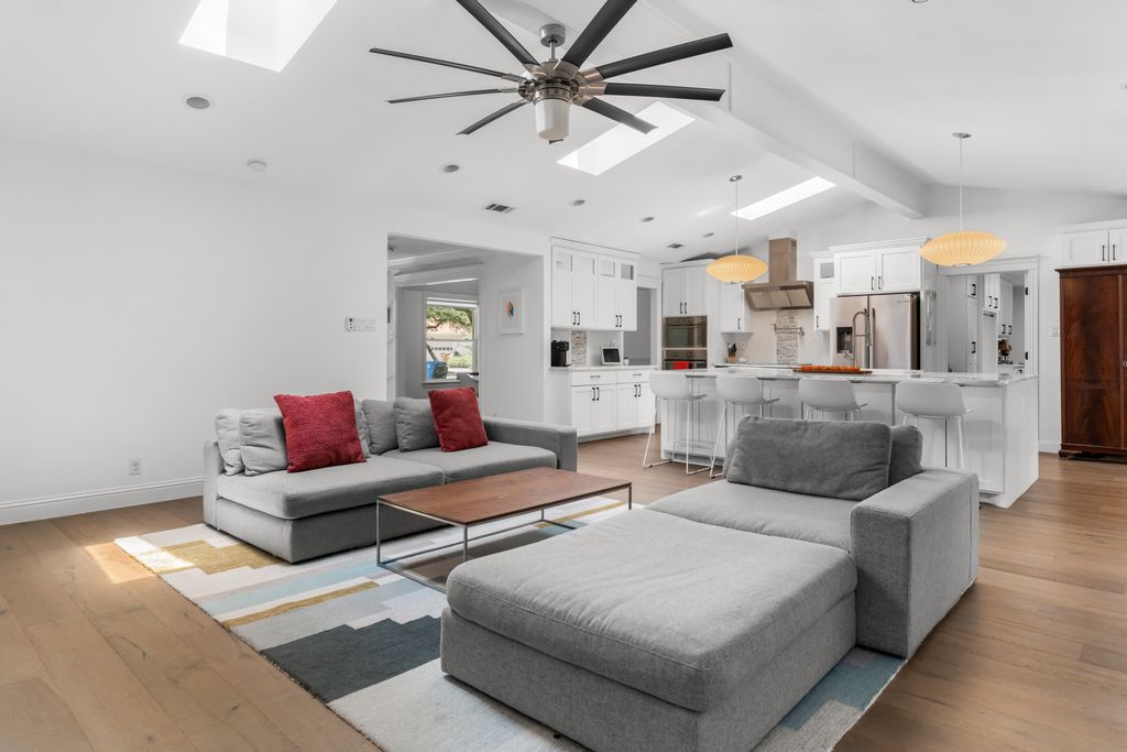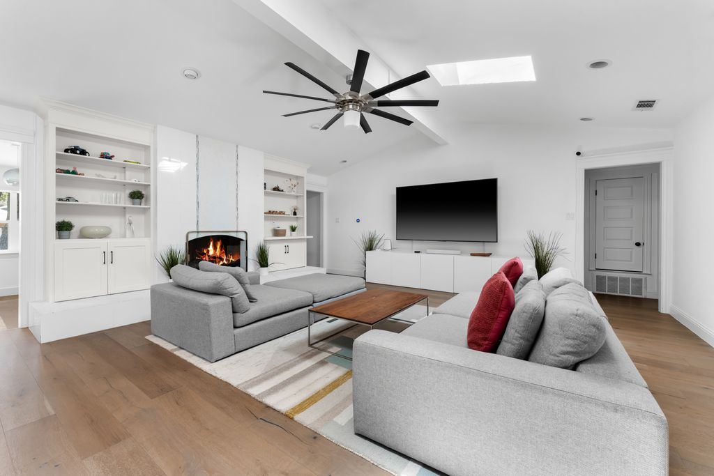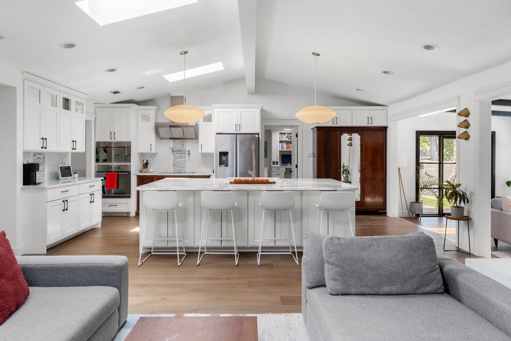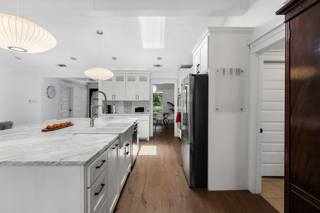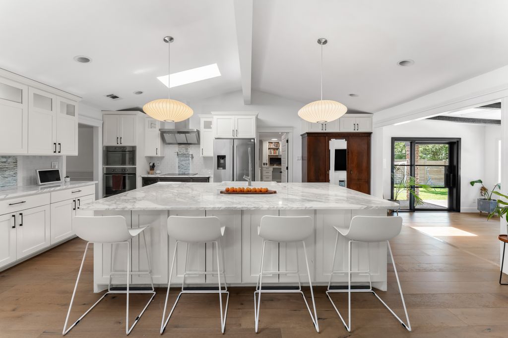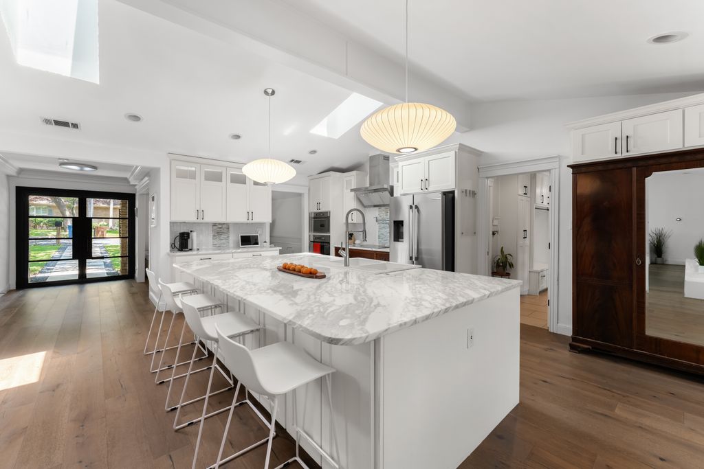 Step inside to experience a state-of-the-art kitchen with solid wood custom cabinetry, imported Calcutta Marble countertops, a full-slab island with seating space, and top-tier Whirlpool stainless steel appliances. The family room is uplifted by three large skylights and a stunning floor-to-ceiling fireplace that creates a luxurious focal point. The family and kitchen areas open to a charming sunroom with expansive views of the backyard. All living areas feature wide plank hand-scraped hardwood floors.