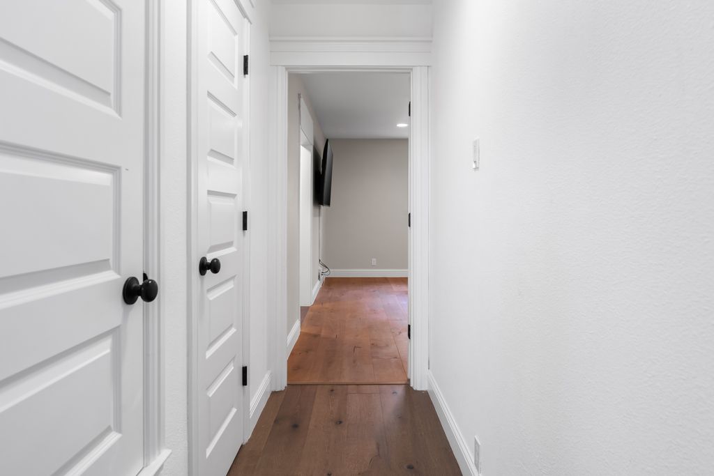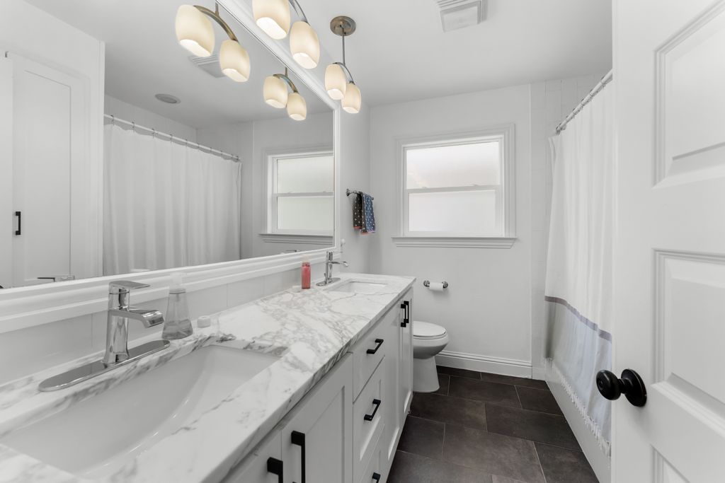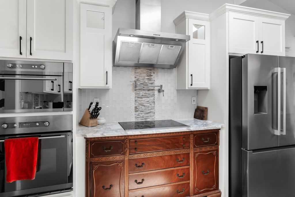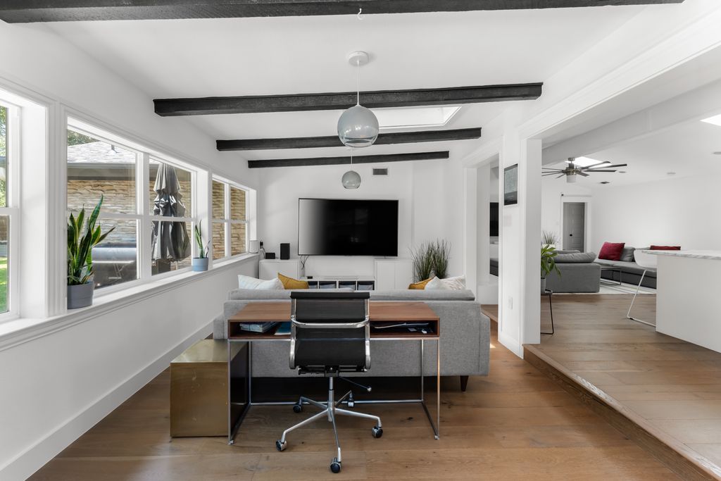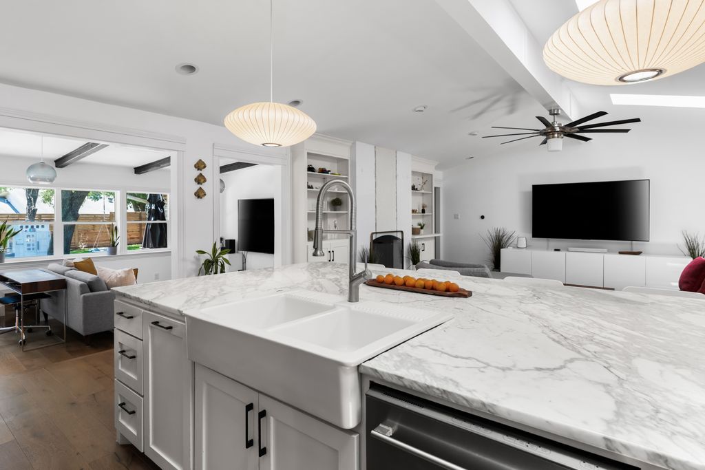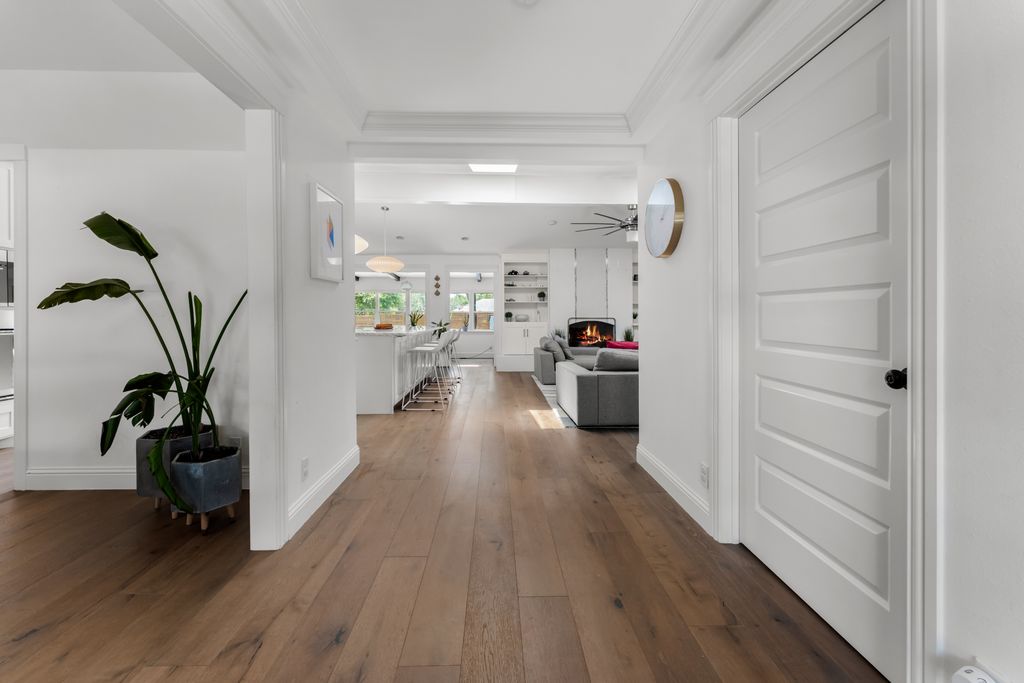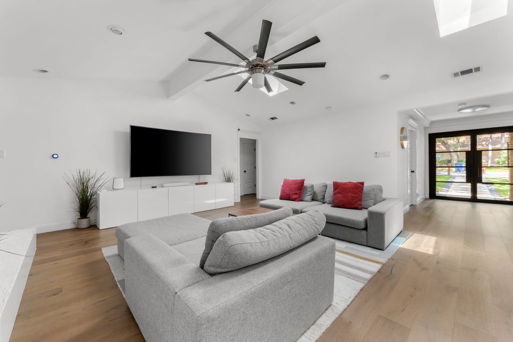Step inside to experience a state-of-the-art kitchen with solid wood custom cabinetry, imported Calcutta Marble countertops, a full-slab island with seating space, and top-tier Whirlpool stainless steel appliances. The family room is uplifted by three large skylights and a stunning floor-to-ceiling fireplace that creates a luxurious focal point. The family and kitchen areas open to a charming sunroom with expansive views of the backyard. All living areas feature wide plank hand-scraped hardwood floors.