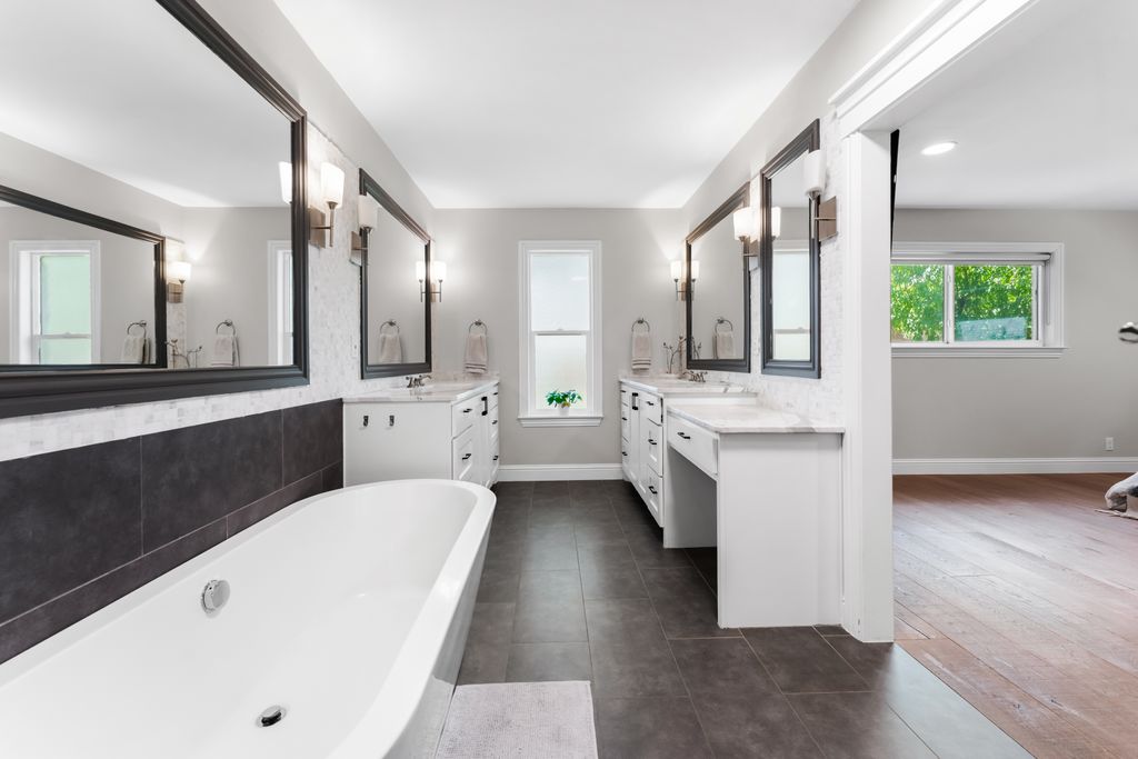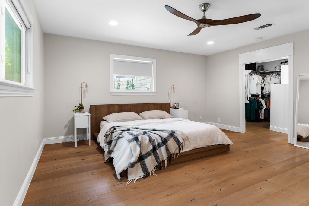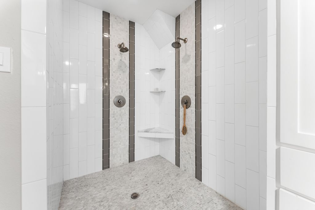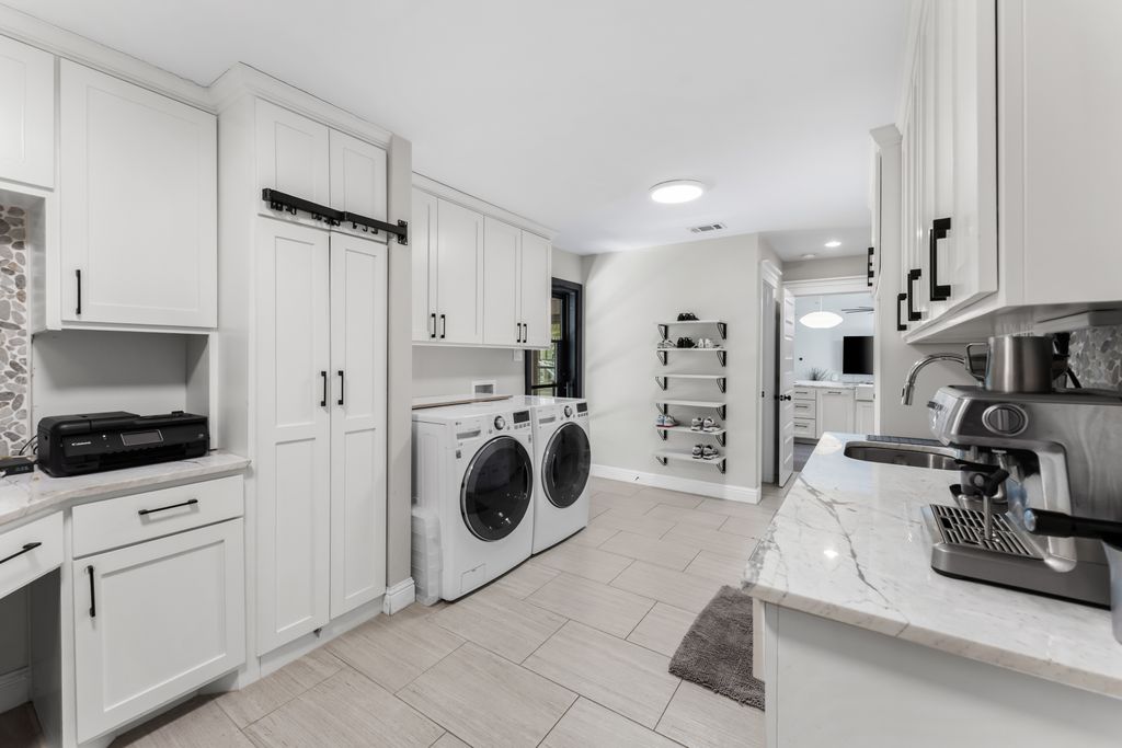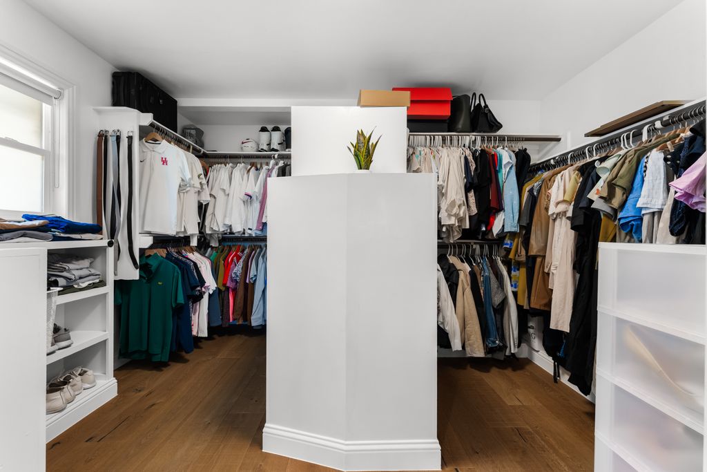 The primary suite includes a walk-in closet with custom shelving and cubbies, as well as elegant en suite featuring a walk-in shower with imported marble, a drop-down dressing table, and a freestanding tub. The secondary bathroom also includes marble countertops and custom cabinetry.
